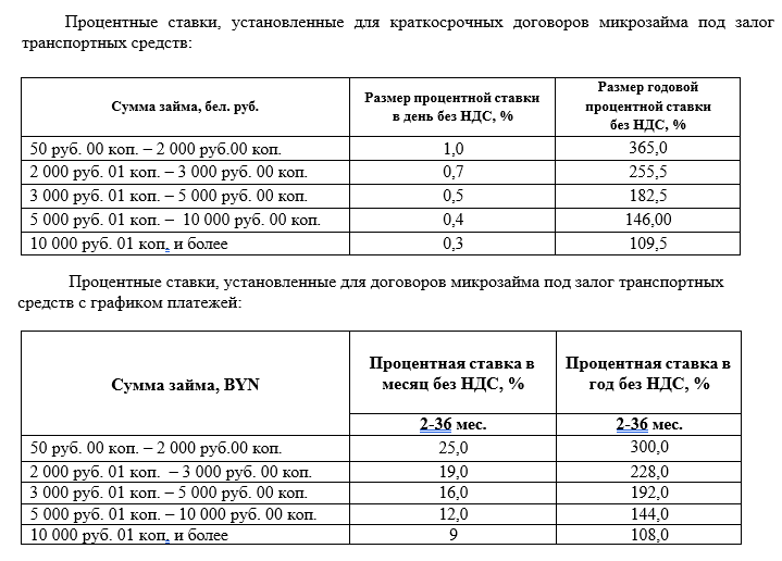 ПРОЦЕНТНЫЕ СТАВКИ, УСТАНОВЛЕННЫЕ ДЛЯ ДОГОВОРОВ МИКРОЗАЙМА ПОД ЗАЛОГ ТРАНСПОРТНЫХ СРЕДСТВ